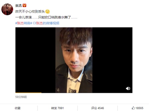 20日下午,张杰在其本人微博分享了一则视频并配文道:“昨天不小心咬到舌头。一会儿表演……只能吹口哨跳香水舞了……”视频中张杰素颜面对镜头,向网友解释自己即将唱歌却咬伤舌头:“一会儿我去参加活动,上面要唱一首歌,我估计是不能唱了。因为昨天我把我的舌头咬到了”。最后张杰还表演了一段吹口哨,可怜又搞笑。